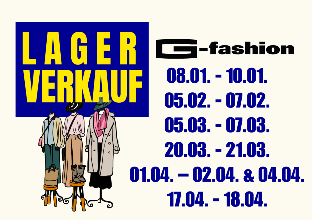 2026 Lagerverkauf Termine 2026 Lagerverkauf Termine Auch 2025 findet der große G-fashion Lagerverkauf statt. Hier findest du die nächsten Termine Wo? Esbachgraben 1, 95463 Bindlach Öffnungszeiten Mo. – Sa. 10:00 – 19:00